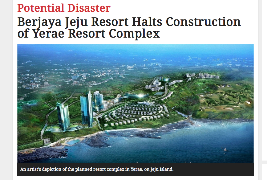 This past summer, construction of the Berjaya Resort Complex, in fact, its six sub-divisions ( Wild Village, Nature Village, Culture Park, Festival Village, Resting Village, and Fantasy Village) came to a halt when the project was ruled against in Korea’s courts. Business Korea reported on the halting of the development last year under the header ‘Potential Disaster’. The article states, as of July 2015, that the JDC (Jeju Development Cooperation) and local government had kept silent about the ruling, but the rumors I have heard suggest that such development in the area, once designated as an Eco-village, was illegal. Below is a screen grab of an artist’s rendition of the project from that publication.